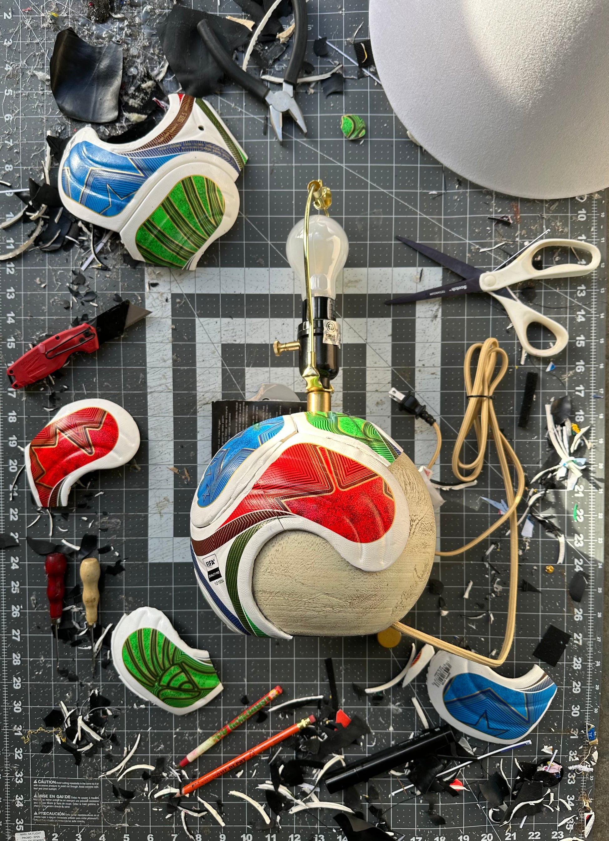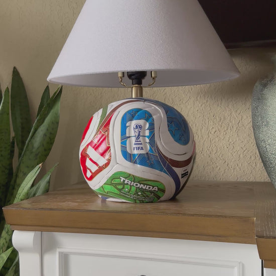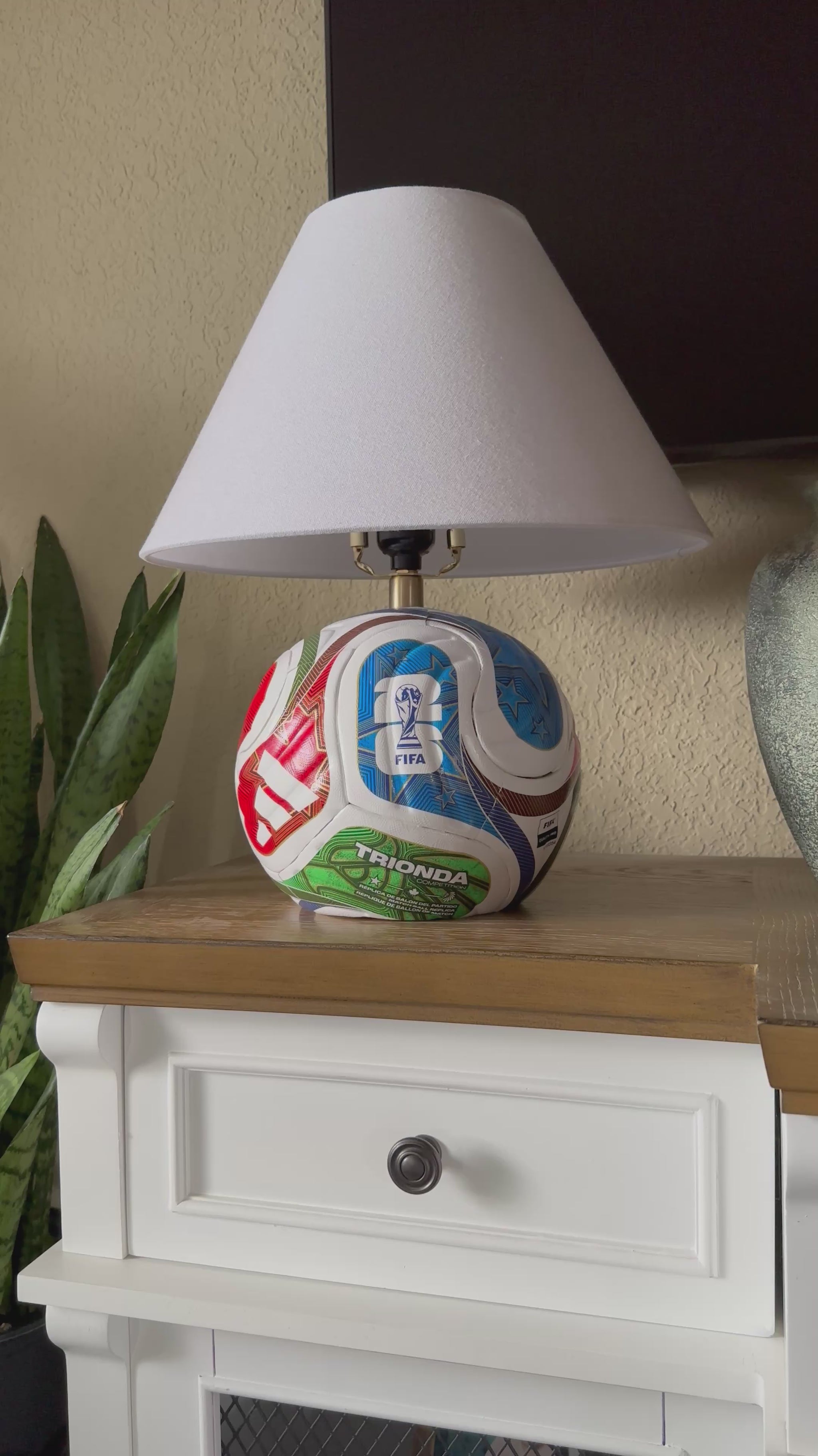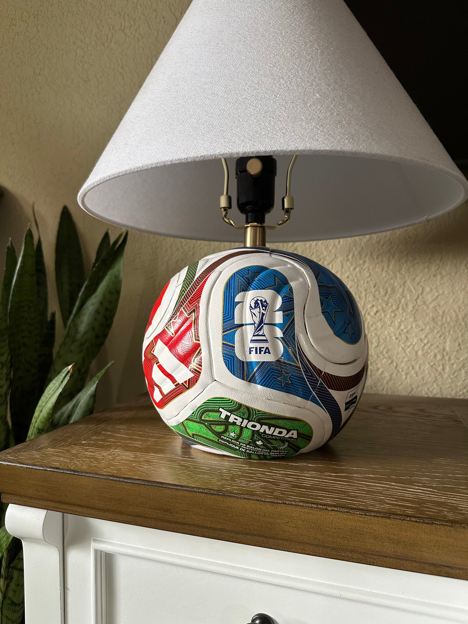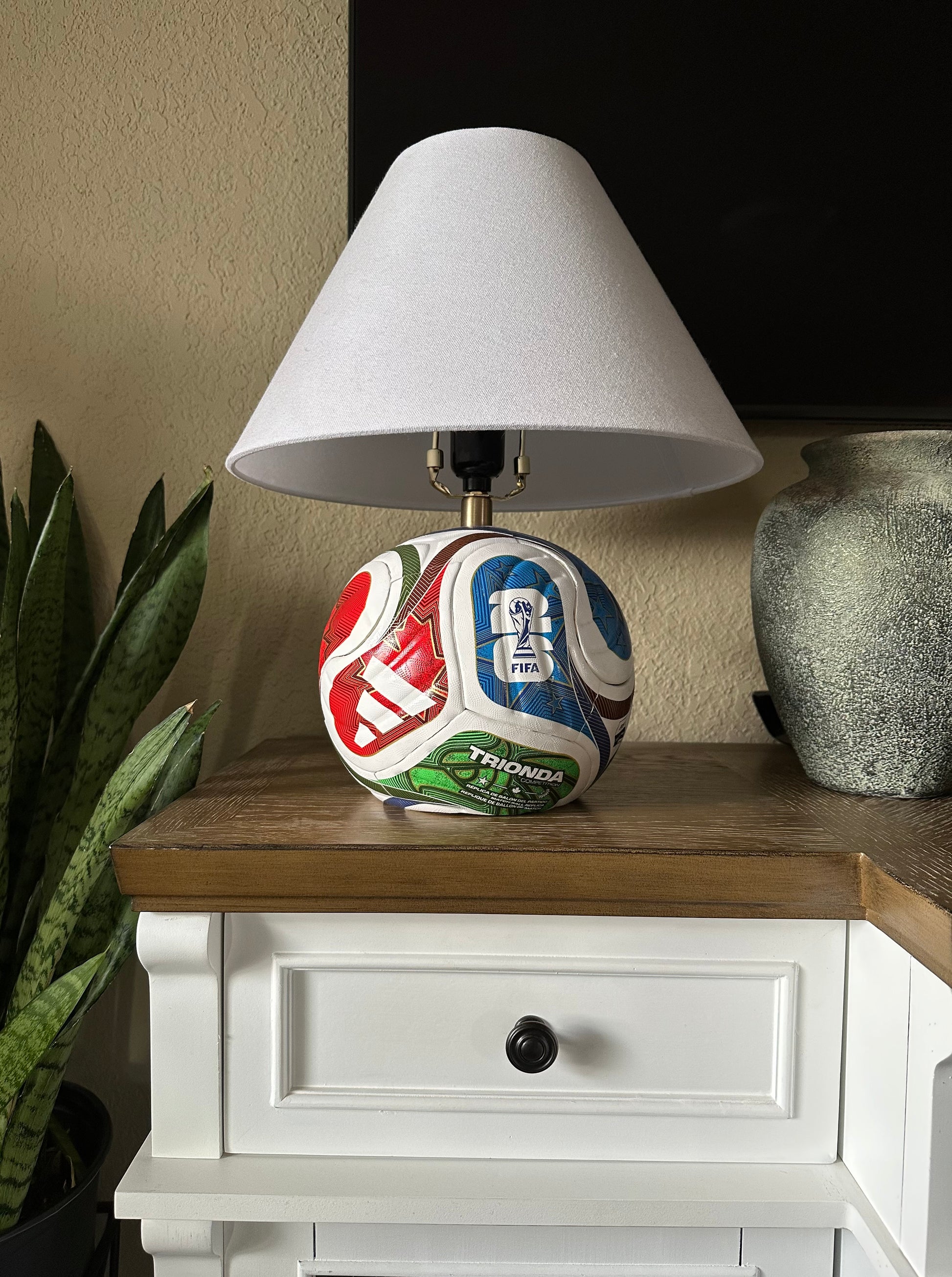 This one of one piece was created using upcycled scraps from an Adidas Trionda ball that we’ll see in the 2026 Fifa World Cup. Each scrap/panel was carefully cut and adhered onto the base of this lamp. Perfect for both the football fan and home decor enthusiast, this is a dimmable lamp that comes with a light bulb.